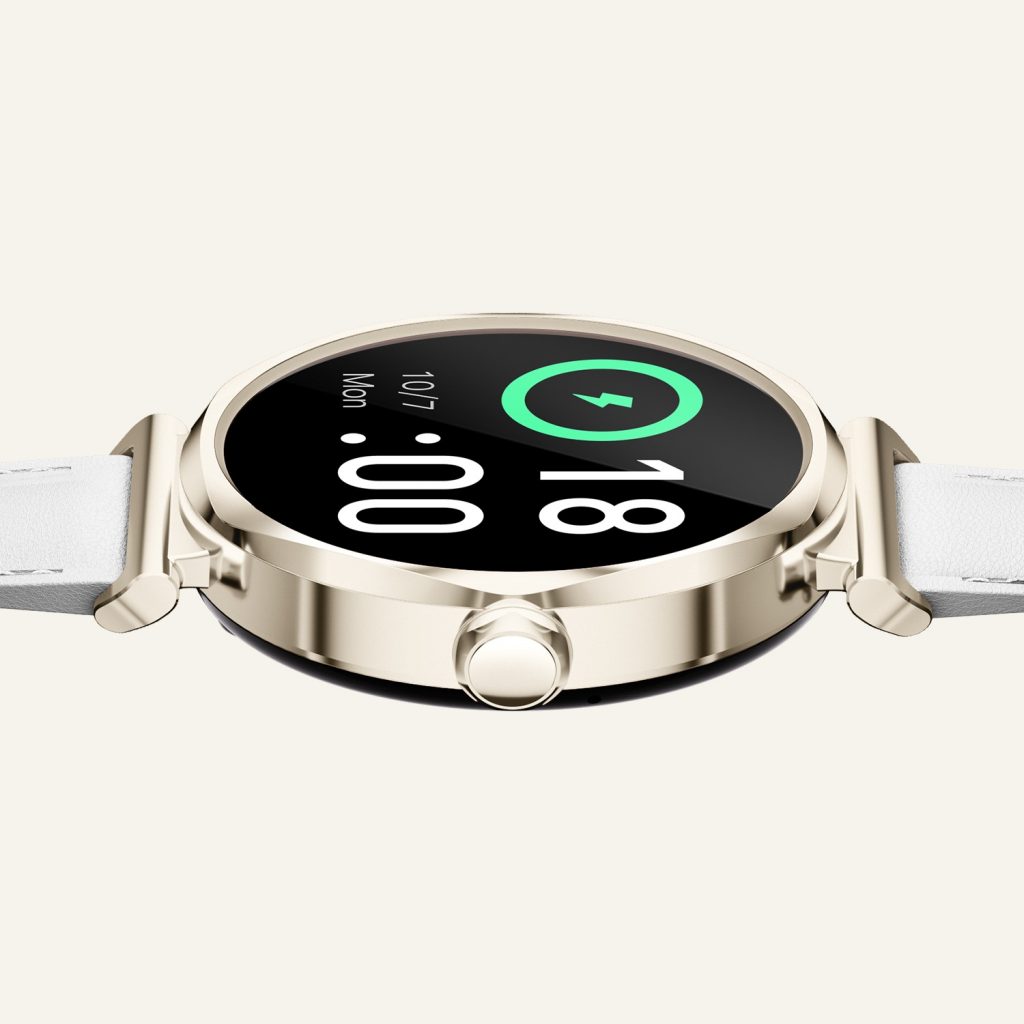 采用 1.27 英寸高清小屏,搭配金叶切面表圈,光影折射出珠宝般的闪耀质感。造型轻盈灵动,兼具时尚与功能,专为追求品质与美感的女性打造。